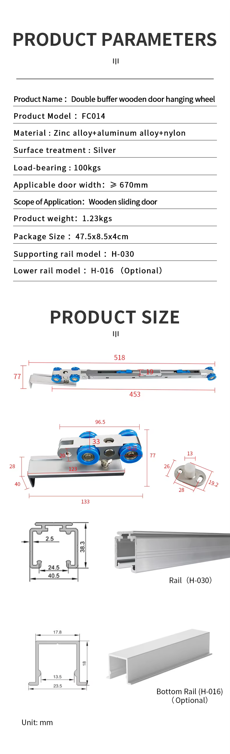 FC014 Soft Closing Damper Buffering Sliding Door Hanging Wheel Rail Kits